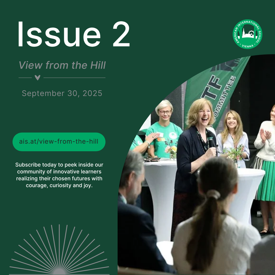 View from the Hill is the AIS Vienna extended community newsletter. Whether you are an alum, a retiree, a former parent, the grandparent of a current student, someone interested in joining the AISV Family, or just a friend of AISV, sign up to peek inside our community of innovative learners realizing their chosen futures with courage, curiosity, and joy.